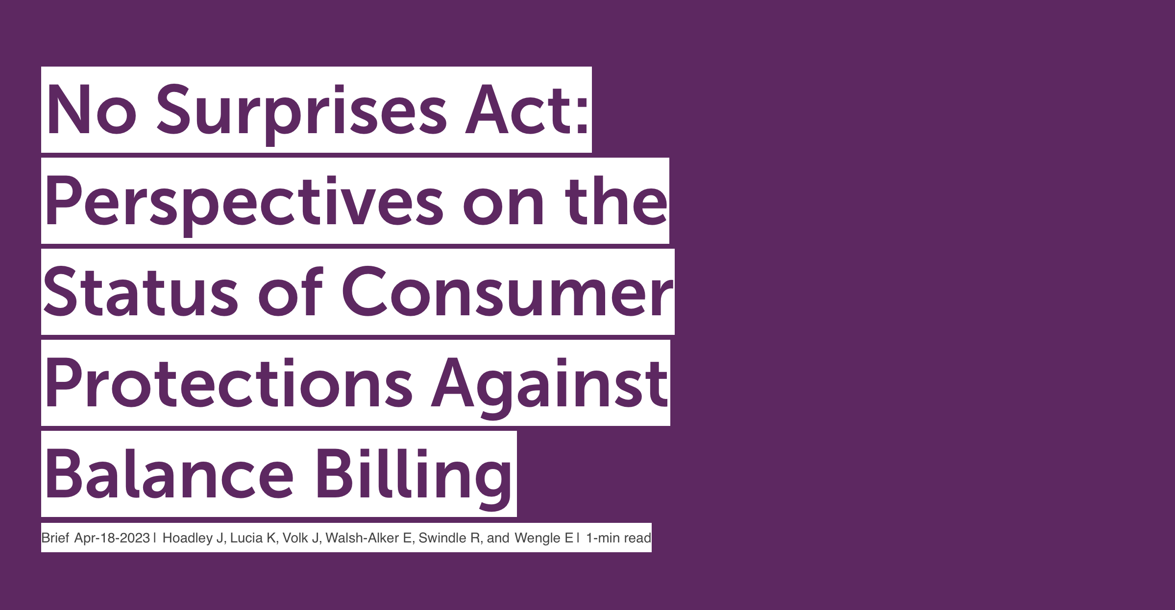 No Surprises Act: Perspectives on the Status of Consumer Protections Against Balance Billing Jack Hoadley, Kevin Lucia, JoAnn Volk, Emma Walsh-Alker, Rachel Swindle, Erik Wengle | 2023-02-13-Please click here to view the publication.